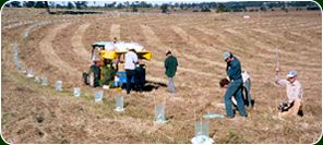 (deep ripping / rotary hoe application) or teams of people manually planting